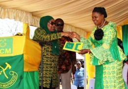 Mgombea Mwenza wa Kiti cha Urais wa Jamhuri ya Muungano wa Tanzania kwa tiketi ya CCM ambae pia ni Makamu wa Rais wa Jamhuri ya Muungano wa Tanzania Mhe. Samia Suluhu Hassan, akimkabidhi kitabu cha Il...