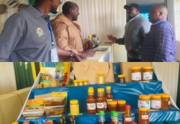 MWENYEKITI wa Chama Cha Mapinduzi Mheshimiwa Thomas Masolwa na Katibu Ndugu Juma Nambaila wakipewa Elimu ya ufugaji Nyuki walipotembelea banda la maonesho ya Nane nane la Halmashauri ya Wilaya ya Song...