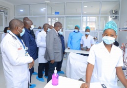 Makamu wa Rais wa Jamhuri ya Muungano wa Tanzania Mhe. Dkt. Philip Mpango akiwajulia hali baadhi ya wagonjwa wanaopata huduma ya kusafisha figo mara baada ya kuzindua Jengo la kutolea huduma ya usafis...
