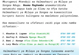 MKURUGENZI Mtendaji wa Halmashauri ya Wilaya ya Songea Ndugu Neema Maghembe anawakaribisha watumishi wote wa ajira mpya wa kada ya Afya na Elimu.